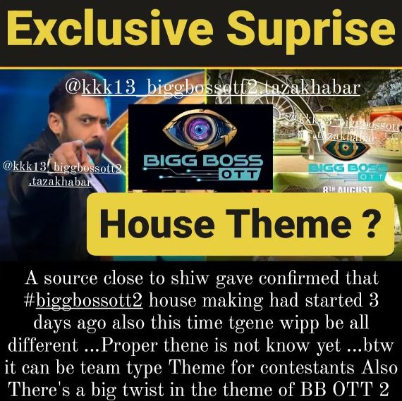 रिपोर्ट्स की मानें तो बिग बॉस ओटीटी के दूसरे सीजन की थीम भी बिल्कुल अलग होगी। बिग बॉस ताजा खबर ने अपने इंस्टाग्राम पेज पर ये जानकारी शेयर की है कि तीन दिन पहले शो का सेट बनना शुरू हुआ है। हालांकि, शो की प्रॉपर थीम क्या है, ये जानकारी तो सामने नहीं आई है, लेकिन रिपोर्ट्स की मानें तो इस बार घर के दो हिस्से होंगे।
