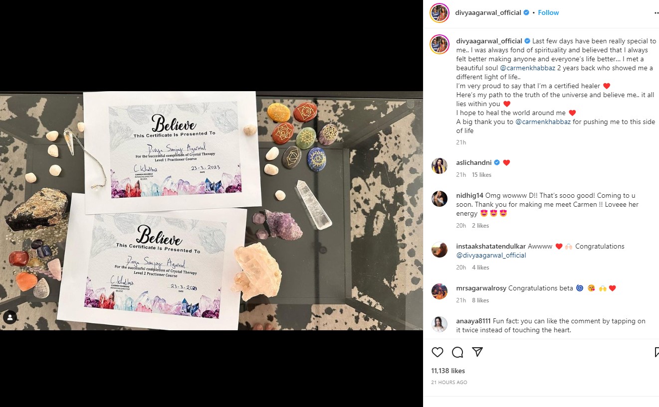 दिव्या अग्रवाल ने इंस्टाग्राम पर पोस्ट किया, 'पिछले कुछ दिन उनके लिए बहुत खास रहे...मैं हमेशा से आध्यात्म को पसंद करती आई हूं और इस बात में यकीन किया है कि दूसरों की जिंदगी को बेहतर बनाकर मैं खुद भी बेहतर महसूस करती हूं...मैंने @carmenkhabbaz से दो साल पहले मुलाकात की जिन्होंने मुझे जिंदगी को दूसरे नजरिये से देखने का मौका दिया। मुझे यह बताने में गर्व महसूस हो रहा है कि मैं सर्टिफाइड हीलर हूं।' एक्ट्रेस को इसके लिए हर तरफ से बधाईयां मिली हैं।
