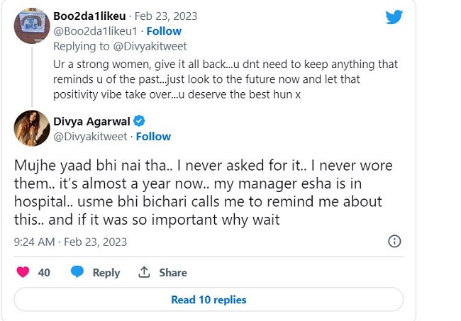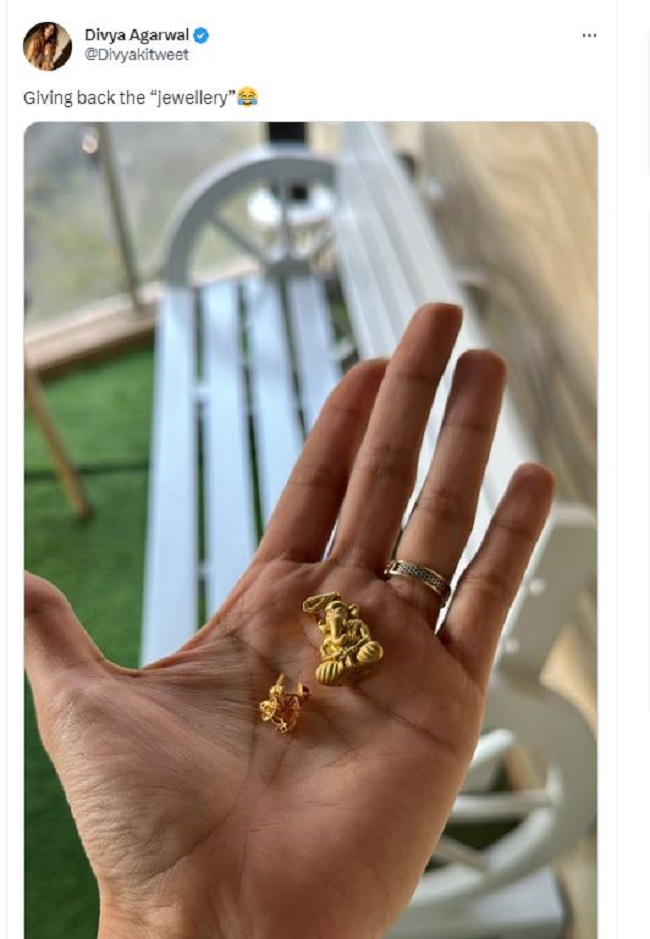 अक्षिता ने दिव्या पर आरोप लगाया कि उन्होंने उनके खानदानी गहने वापस नहीं किए थे। इसपर दिव्या ने प्रतिक्रिया दी है। उन्होंने कहा है कि उन्होंने ना ही कभी गहनों की मांग की थी और ना ही कभी उन्हें पहना है। उन्होंने यह भी कहा कि फिलहाल उनकी मैनेजर हॉस्पिटल में है। इसके बावजूद वह फोन ले रही है। दिव्या अग्रवाल ने यह भी लिखा कि वरुण सूद ने ने बिग बॉस के दौरान एक जर्सी दी थी उसे भी वापस ले ली हैं।