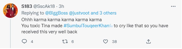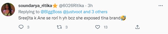टीना दत्ता की आंखों में आंसू देखने के बाद सोशल मीडिया पर लोग टीना दत्ता के आंसुओ को नकली बता रहे हैं और साथ ही ये उन्होंने इसे टीना का कर्मा बताया। एक यूजर ने कमेंट करते हुए लिखा, 'कर्मा, कर्मा, आपने सुम्बुल तौकीर खान को इसी तरह से रूलाया था और आपको ये वैसे ही वापस मिला है'। दूसरे यूजर ने लिखा, 'श्रीजिता के आने से रो रही है ये क्योंकि उसने इसके ब्रांड को एक्सपोज कर दिया है'। अन्य यूजर ने लिखा, 'जब सब इसके(सौंदर्या)के कैरेक्टर पर सवाल उठाते थे आप उसके लिए बोलती थीं तब कुछ नहीं। अब रो रोकर सहानुभूति ले रही हैं।