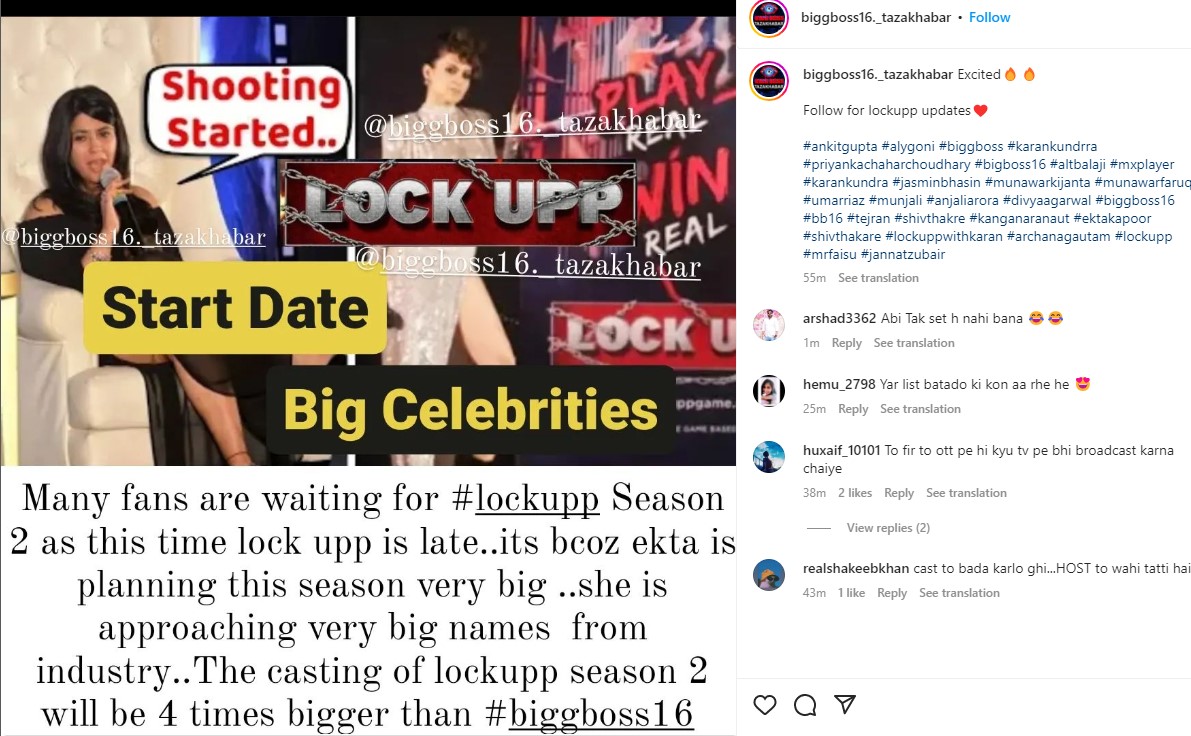 मीडिया रिपोर्ट्स के मुताबिक, एकता कपूर 'लॉक अप 2' को 'बिग बॉस 16' से भी बड़ा बनाना चाहती हैं। खबर है कि 'लॉक अप 2' की कास्टिंग बिग बॉस 16 से चार गुना बड़ी होगी। एकता कपूर सेकेंड सीजन में इंडस्ट्री से बड़े लोगों को लेना चाहती हैं और उन्होंने कई लोगों को अप्रोच भी किया है। बहरहाल, अब तक कई कंटेस्टेंट्स के नाम सामने आ चुके हैं और इनमें से दो को फाइनल कर लिया गया है।