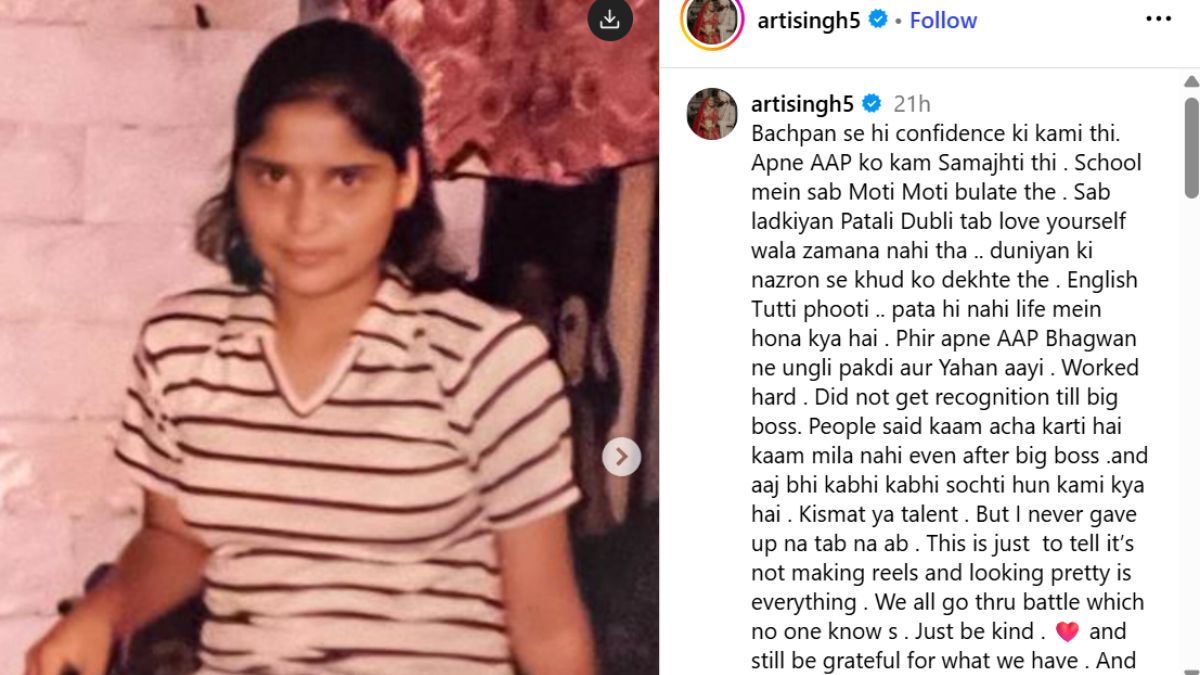 मौजूदा समय में एक वायरल सोशल मीडिया पोस्ट को लेकर आरती सिंह का नाम चर्चा में बना हुआ है, जिसमें उन्होंने अपने बचपन के उन दिनों को याद किया है, जब स्कूल में उनकी बॉडी शेमिंग की जाती थी। आइए जानते हैं कि अपने इस पोस्ट में आरती सिंह ने और क्या-क्या कहा है।