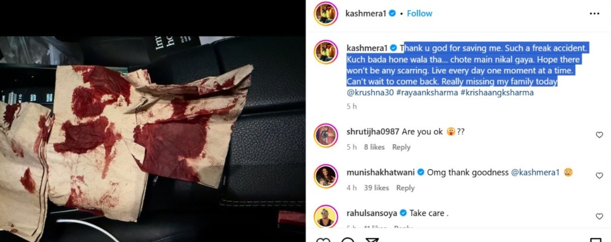 इसके अलावा कश्मीरा शाह ने एक तस्वीर भी शेयर की है, जिसमें सबकुछ खून से लथपथ नजर आ रहा है। पोस्ट में उन्होंने हादसे के बारे में विस्तार से बताया है और अपना हेल्थ अपडेट भी दिया है।