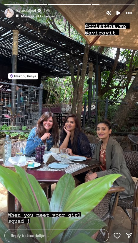 दलजीत कौर ने सोशल मीडिया पर केन्या से अपनी फोटो शेयर की है। तस्वीर में अभिनेत्री अपने दोस्तों के साथ हैंगआउट करते हुए नजर आ रही हैं। पोस्ट शेयर करते हुए दलजीत कौर ने कैप्शन में लिखा, "जब आप अपनी गर्ल गैंग से मिलते हैं।" इसके साथ ही उन्होंने लोकेशन टैग करते हुए लिखा, "नैरोबी, केन्या।"