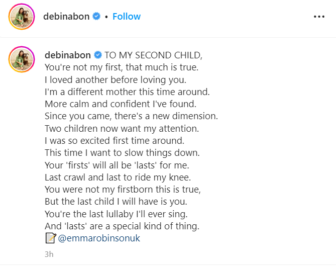 इसी के साथ देबिना ने कैप्शन में प्यारी सी कविता लिखी है- मेरे दूसरे बच्चे के लिए, तुम मेरे पहले नहीं हो, यह सच है। मैं तुमसे प्यार करने से पहले दूसरे से प्यार करती थी। मैं इस बार एक अलग मां हूं। मैंने अधिक शांत और आत्मविश्वास पाया है। जब से तुम आए, एक नया आयाम है। दो बच्चे अब मेरी अटेंशन चाहते हैं। मैं पहली बार इतनी उत्साहित थी। इस बार मैं चीजों को धीमा करना चाहती हूं। आपका 'फर्स्ट' मेरे लिए 'लास्ट' होगा। तुम मेरी पहली संतान नहीं हो यह सच है, लेकिन मेरे पास आखिरी बच्चा तुम ही हो। तुम आखिरी लोरी हो जो मैं कभी गाऊंगी और आखिरी होना अपने आप में एक खास।