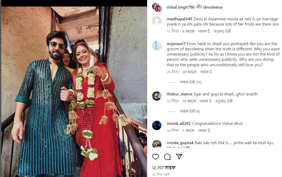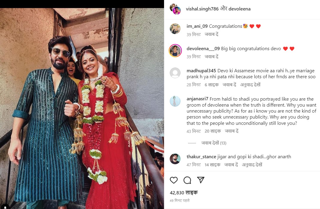 विशाल सिंह ने देवोलीना भट्टाचार्जी की दुल्हन के गेटअप में तस्वीर शेयर की है। शाइनिंग शेरवाली पहने विशाल ने इस मौके पर देवोलीना का हाथ थामा हुआ है। जैसे ही यह तस्वीर सामने आई, फैंस द्वारा उनके सोशल मीडिया अकाउंट पर बधाइयों का तांता लग गया है। कई लोगों ने उन्हें कॉन्ग्रैचुलेशन्स कहा है। तो वहीं, कुछ इसे फेक बता रहे हैं। कई फैंस को उनकी यह तस्वीर कई फैंस को पसंद नहीं आई। एक यूजर ने शादी की इस तस्वीर को घोर अनर्थ बताया है।