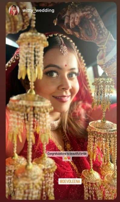 नई दिल्ली, जेएनएन। Devoleena Bhattacahrjee Marriage: 'साथ निभाना साथिया' की गोपी बहू यानी कि देवोलीना भट्टाचार्जी आखिरकार दुल्हन बन गई हैं। हल्दी और मेहंदी सेरेमनी की तस्वीरें और वीडियो शेयर करने के बाद एक्ट्रेस ने दुल्हन के गेटअप में अपनी नई तस्वीर शेयर की है। कई फैंस उन्हें दुल्हन के रूप में देख गदगद हो गए हैं। देवोलीना की शादी की तस्वीर पर सोशल मीडिया के हर सेक्शन पर उन्हें बधाई दी जा रही है, तो वहीं कुछ इसे फेक बता रहे हैं।