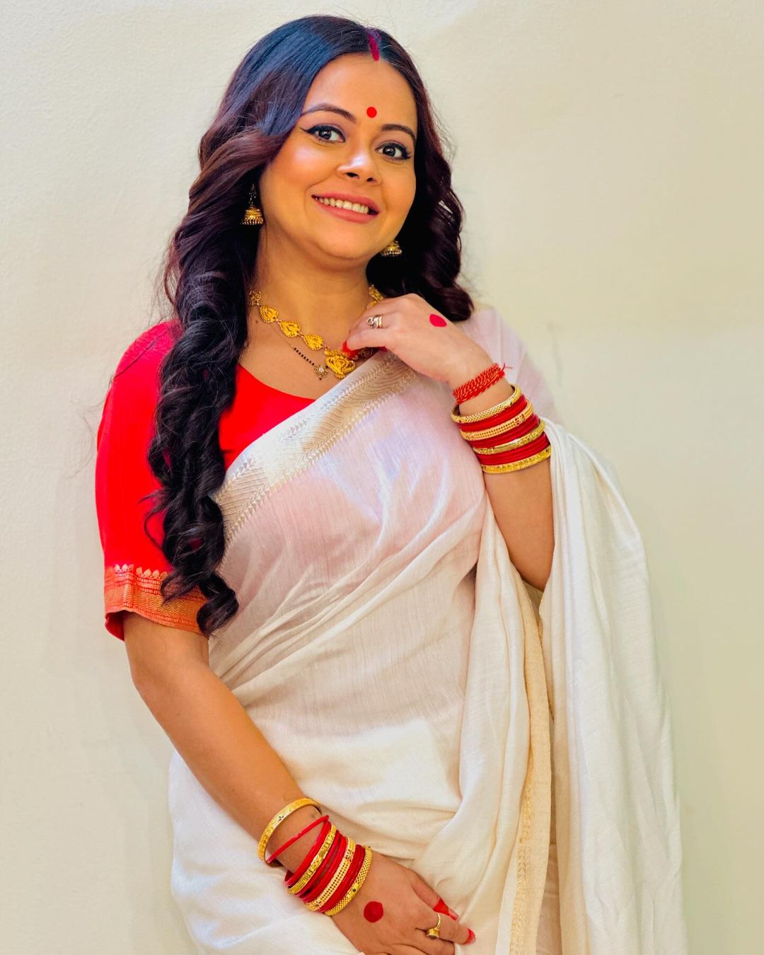 इस लुक में देवोलीना बिल्कुल बंगाली अंदाज में नजर आ रही हैं। उन्होंने व्हाइट साड़ी के साथ रेड ब्लाउज और हैवी मेकअप कैरी किया है।