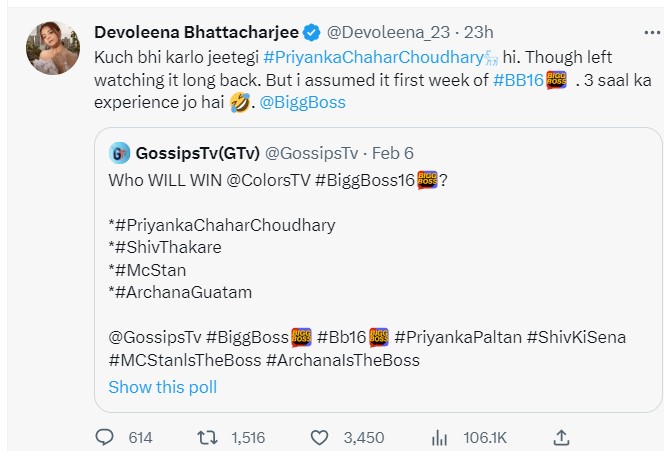 देवोलीना ने ट्वीट किया, 'कुछ भी कर लो जीतेगी #PriyankaChaharChoudhary ही। मैंने बहुत पहले ही बिग बॉस देखना छोड़ दिया। लेकिन #BiggBoss16 के पहले हफ्ते में ही यह अंदाजा लग गया था। तीन साल का एक्सपीरियंस जो है।'