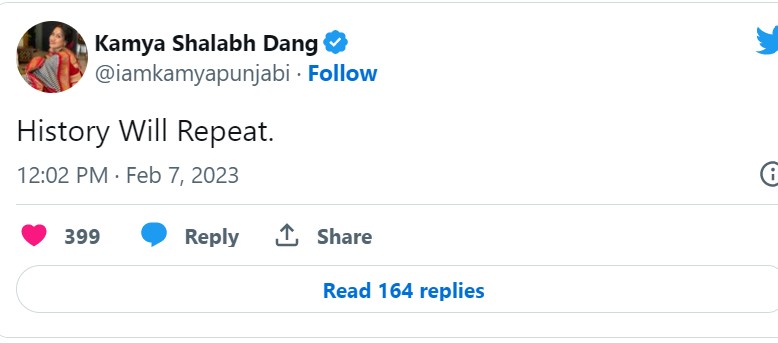 देवोलीना के बाद बिग बॉस की एक और एक्स कंटेस्टेंट ने बिग बॉस के मेकर्स पर अपने ट्वीट से मेकर्स पर तंज कसा है। बिग बॉस 7 की कंटेस्टेंट रह चुकीं काम्या पंजाबी (Kamya Punjabi) ने कहा है कि इतिहास दोहराया जाएगा। यह बात उन्होंने ट्वीट के जरिये कही। उनके ट्वीट पर कई फैंस ने अंदाजा लगाया है कि वह शिव ठाकरे के जीतने की बात कर रही हैं, क्योंकि शिव, बिग बॉस मराठी सीजन के विनर रहे हैं।