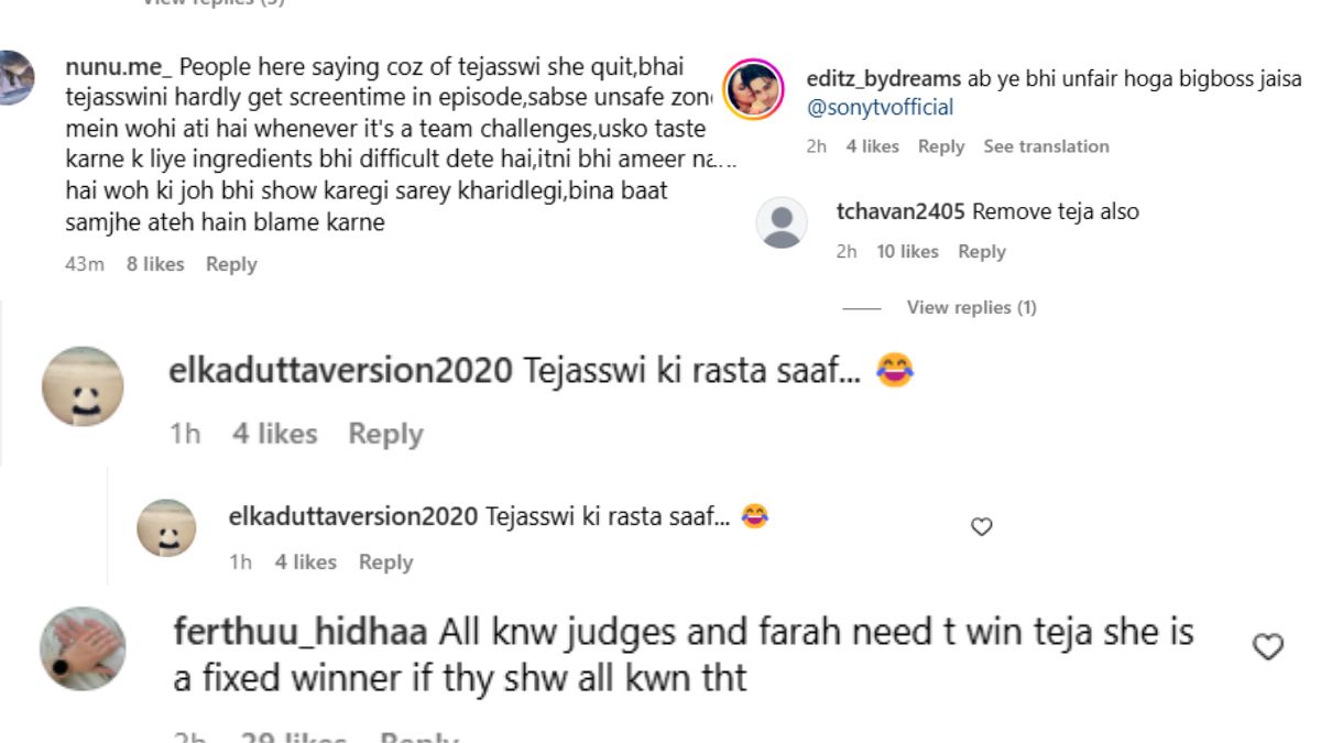 दूसरे यूजर ने लिखा, "तेजस्वी का रास्ता साफ हो गया"। एक और अन्य यूजर ने लिखा, "हमें तो पता था कि तेजस्वी प्रकाश ही शो की फिक्स विनर है"। एक अन्य यूजर ने शो की तुलना बिग बॉस से ही कर दी और लिखा, "क्या अब ये शो भी बिग बॉस की तरह ही अनफेयर होगा"।