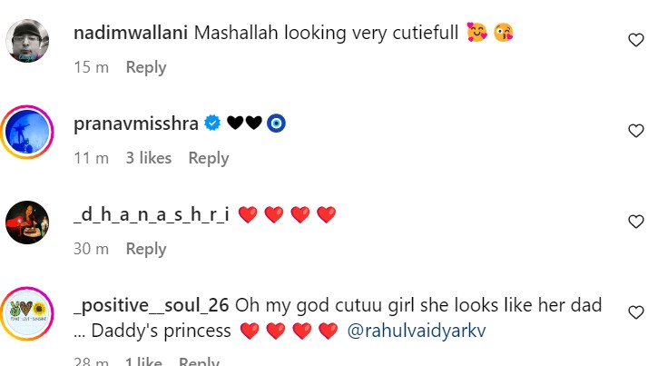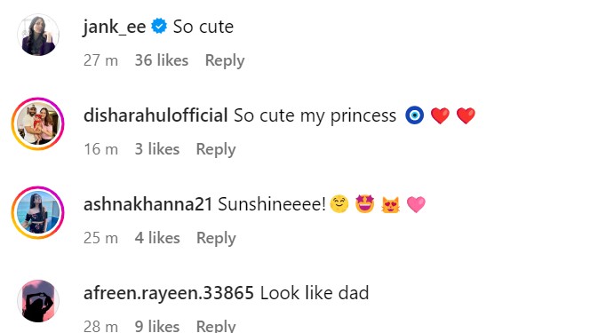 दिशा और उनकी बेटी नव्या की इन तस्वीरों को देखकर फैंस को राहुल वैद्य की याद आ रही है। एक यूजर ने इन फोटो पर कमेंट कर लिखा है- वाह बहुत सुंदर ये तो अपने पापा की तरह की दिखती है। एक अन्य यूजर ने कहा है- बहुत ज्यादा क्यूट है पापा की शहजादी पूरी तरह से उनकी हमशक्ल लगती है।