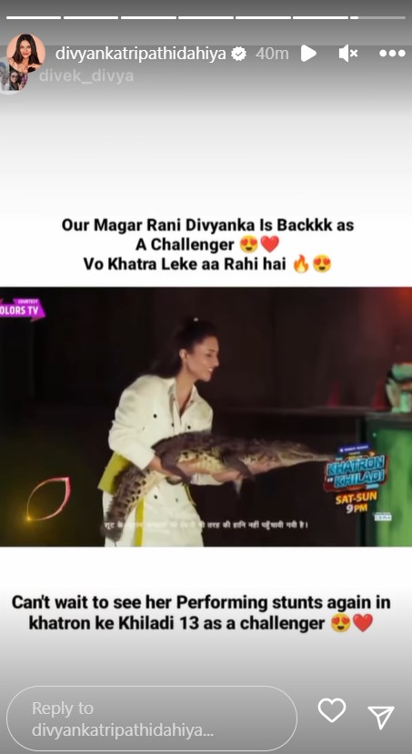 इस वीडियो को दिव्यांका के फैन ने शेयर किया है, जिसे एक्ट्रेस ने अपनी इंस्टा स्टोरी पर री-शेयर किया। बता दें कि दिव्यांका 'खतरों के खिलाड़ी 11' का हिस्सा रह चुकी हैं। मजबूत कंटेस्टेंट होने के बावजूद वह शो जीतने से चूक गईं, लेकिन लाखों लोगों का दिल जरूर जीत लिया।