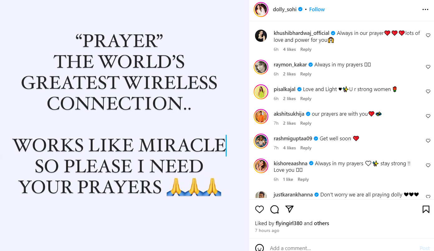 मंगलवार की सुबह लगभग 8 बजे अभिनेत्री ने अपने इंस्टाग्राम हैंडल पर एक पोस्ट साझा किया, "प्रार्थनाएं दुनिया का सबसे बड़ा वायरलेस कनेक्शन चमत्कार की तरह काम करता है, इसलिए मुझे आपकी प्रार्थनाओं की जरूरत है।" बीते दिनों डॉली सोही ने टाइम्स ऑफ इंडिया को दिए इंटरव्यू में बताया था, कि वो सर्वाइकल कैंसर से जूझ रही हैं। उनकी कीमोथेरेपी पूरी हो चुकी है और अब रेडिएशन थेरेपी शुरू हो चुकी है।