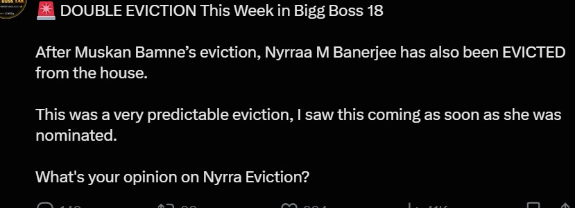 मुस्कान बामने का बिग बॉस 18 से जाना उनके फैंस को अच्छा नहीं लगा। वहीं, डबल एलिमिनेशन के तहत इसी हफ्ते एक और महिला कंटेस्टेंट को बाहर का रास्ता दिखाया जाएगा। बिग बॉस तक की खबर के अनुसार, 'बिग बॉस 18' से एलिमिनेट होने वाली तीसरी कंटेस्टेंट नायरा बनर्जी (Nyra Banerjee) हैं। उन्हें डबल एिलिमिनेशन के तहत एलिमिनेट किया गया है।