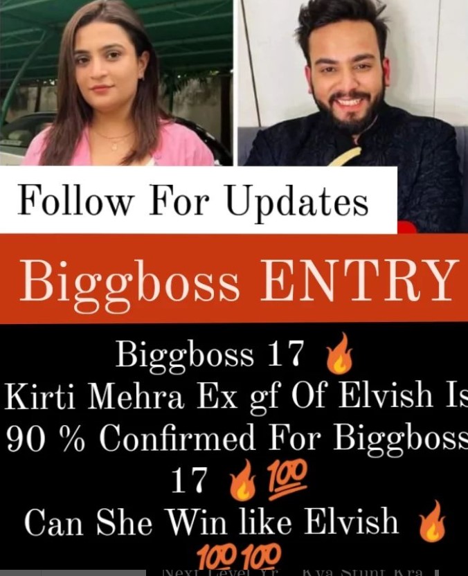 अंकिता लोखंडे, विक्की जैन, कंवर ढिल्लों, शिल्पा सेठी, मनस्वी ममगई, अरमान मलिक, पायल मलिक, ईशा मालविया, अभिषेक कुमार, नील भट्ट, ऐश्वर्या शर्मा, अभिषेक कुमार का नाम सामने आ चुका है। इन सबके बाद एक और पॉपुलर नाम सामने आया है। ये नाम है कीर्ति मेहरा का, जो कि एक समय में एल्विश यादव को डेट करती थीं।