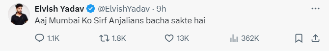 अब जब एल्विश यादव जेल से बाहर आए हैं, तो वह भी अंजलि अरोड़ा और उनके फैंस पर निशाना साधने से पीछे नहीं रहे हैं। उन्होंने अपने एक्स अकाउंट पर एक ट्वीट करते हुए लिखा, "आज मुंबई को सिर्फ अन्जिलियंस ही बचा सकते हैं"।
