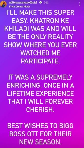 उन्होंने अपनी इंस्टा स्टोरी पर एक पोस्ट शेयर करते हुए लिखा, "मैं इस चीज को आपके लिए आसान बना देता हूं। खतरों के खिलाड़ी एक अकेला ऐसा रियलिटी शो था और होगा जिसमें आपने मुझे देखा है। वह बहुत ही शानदार अनुभव था, जिसको मैं हमेशा चीयर करूंगा। बिग बॉस ओटीटी को उनके नए सीजन के लिए बधाई"।