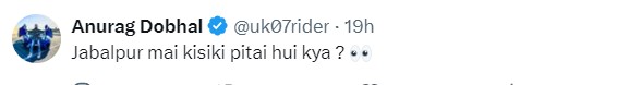 'यूके राइडर' के नाम से फेमस अनुराग डोभाल ने ट्वीट कर पूछा कि क्या जबलपुर में किसी की पिटाई हुई है। दरअसल अनुराग का इशारा मुनव्वर फारूकी की तरफ था, जिनके जबलपुर में पिटने की खबर सामने आई है।