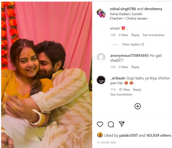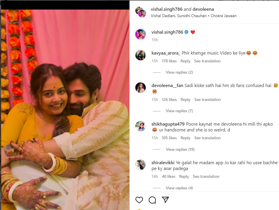 इंस्टाग्राम पर विशाल सिंह और देवोलीना भट्टाचार्जी ने एक वीडियो शेयर किया है, जिसमें देवोलीना मेहंदी लगाए बैठी हैं और विशाल भी उनके साथ हैं। दोनों एक दूसरे के साथ मौज मस्ती कर रहे हैं। दोनों एक्टर्स 'हुआ छोकरा जवां रे' पर थिरकते हुए दिखाई दे रहे हैं। उनके वीडियो पर कई फैंस को कन्फ्यूजन है कि क्या यह दोनों साथ में शादी कर रहे हैं। एक ट्रोल ने लिखा- 'यह गलत है मैडम आप जो कर रही हैं उससे बच्चे पर क्या असर पड़ेगा।'