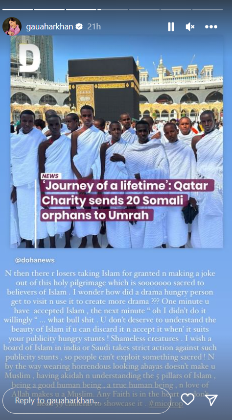 अब इन सबके बीच टीवी एक्ट्रेस गौहर खान ने राखी पर निशाना साधा है। गौहर के अलावा भी कई लोगों ने उन पर धार्मिक चीजों को प्रचार स्टंट के रूप में यूज करने का आरोप लगाया है। एक्ट्रेस गौहर खान ने अपनी इंस्टाग्राम स्टोरी पर एक पोस्ट शेयर किया है और खूब खरी-खोटी सुनाई है। गौहर ने लिखा, "फिर कुछ हारे हुए लोग इस्लाम को हल्के में ले रहे हैं और इस पवित्र तीर्थयात्रा का मजाक बना रहे हैं जो इस्लाम के विश्वासियों के लिए बहुत पवित्र है। एक मिनट आपने इस्लाम कबूल कर लिया और फिर आप कहती हैं "ओह, मैंने यह अपनी मर्जी से नहीं किया" .. क्या बकवास है।
