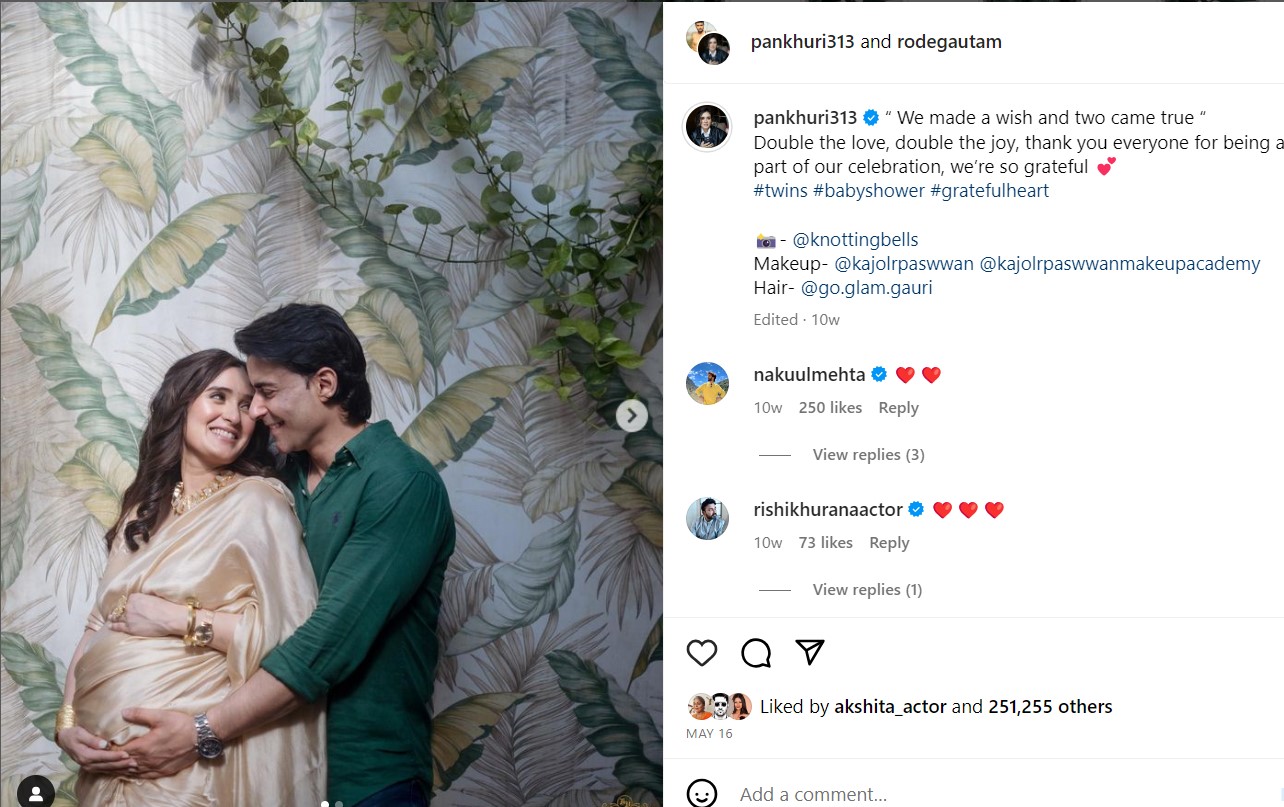मई में पंखुड़ी की गोदभराई सेरेमनी आयोजित की गई थी। इसकी कुछ तस्वीरें एक्ट्रेस ने सोशल मीडिया पर शेयर करने के साथ ही इस बात की जानकारी शेयर की थी कि उन्हें जुड़वा बच्चे होने वाले हैं।
