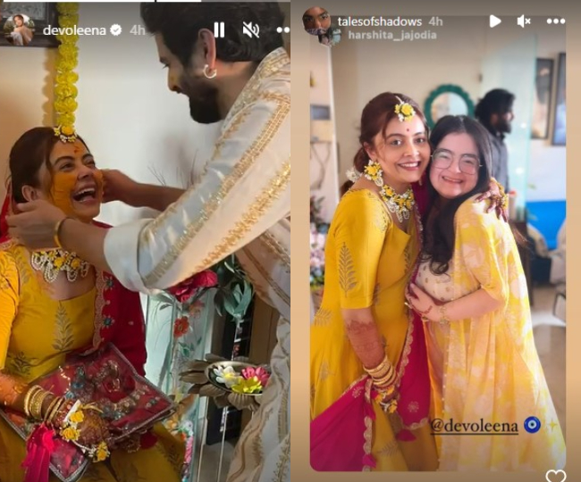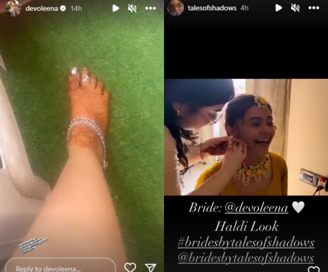 देवोलीना भट्टाचार्जी ने अपनी इंस्टा स्टोरी पर कई वीडियोज और तस्वीरें साझा की हैं। इन तस्वीरों को देखने के बाद फैंस काफी हैरान हैं और यह अंदाजा लगा रहे हैं वह जल्द ही शादी के बंधन में बंधने के लिए बिलकुल तैयार हैं। देवोलीना ने अपनी पहली वीडियो इंस्टा स्टोरी पर शेयर की है, उसमें उनके पैरों में मेहंदी लगी हुई दिखाई दे रही है, तो वहीं दूसरी तस्वीर में एक्ट्रेस के खास दोस्त विशाल उनके गालों पर प्यार से हल्दी लगाते हुए दिखाई दे रहे हैं । इन तस्वीरों में गोपी बहू येलो रंग के सूट में नजर आ रही हैं और उन्होंने अपने हाथ में कुछ शगुन का सामान लिया हुआ है। उनके चेहरे की खुशी किसी भी ब्राइडल से कम नहीं लग रही हैं। इसके अलावा उनके खास दोस्त विशाल सिंह ने भी अपने इंस्टाग्राम पर वीडियो शेयर किया है जिसमें वह दोनों हल्दी सेरेमनी में एन्जॉय करते हुए नजर आ रहे हैं।