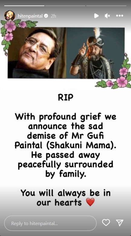 गूफी पेंटल के रिश्तेदार और एक्टर हितेन पेंटल ने एक्टर के निधन की खबर देते हुए लिखा, "हमें ये बताते हुए बेहद दुख हो रहा है कि गूफी पेंटल (शकुनि मामा) का उनके परिवार के बीच निधन हो गया है। आप हमेशा हमारे दिलों में रहेंगे। आपकी आत्मा को शांति मिले।"