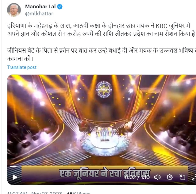 मुख्यमंत्री मनोहर लाल ने मयंक के पिता से बात की और उन्हें चंडीगढ़ आने का न्योता दिया। उन्होंने मयंक के पिता से क्या बात की, इसका वीडियो सोशल मीडिया पर शेयर किया है। एक्स पर वीडियो पोस्ट करते हुए उन्होंने लिखा, ''हरियाणा के महेंद्रगढ़ के लाल, आठवीं कक्षा के होनहार छात्र मयंक ने KBC जूनियर में अपने ज्ञान और कौशल से 1 करोड़ रुपये की राशि जीतकर प्रदेश का नाम रोशन किया है। जीनियस बेटे के पिता से फ़ोन पर बात कर उन्हें बधाई दी और मयंक के उज्जवल भविष्य की कामना की।''