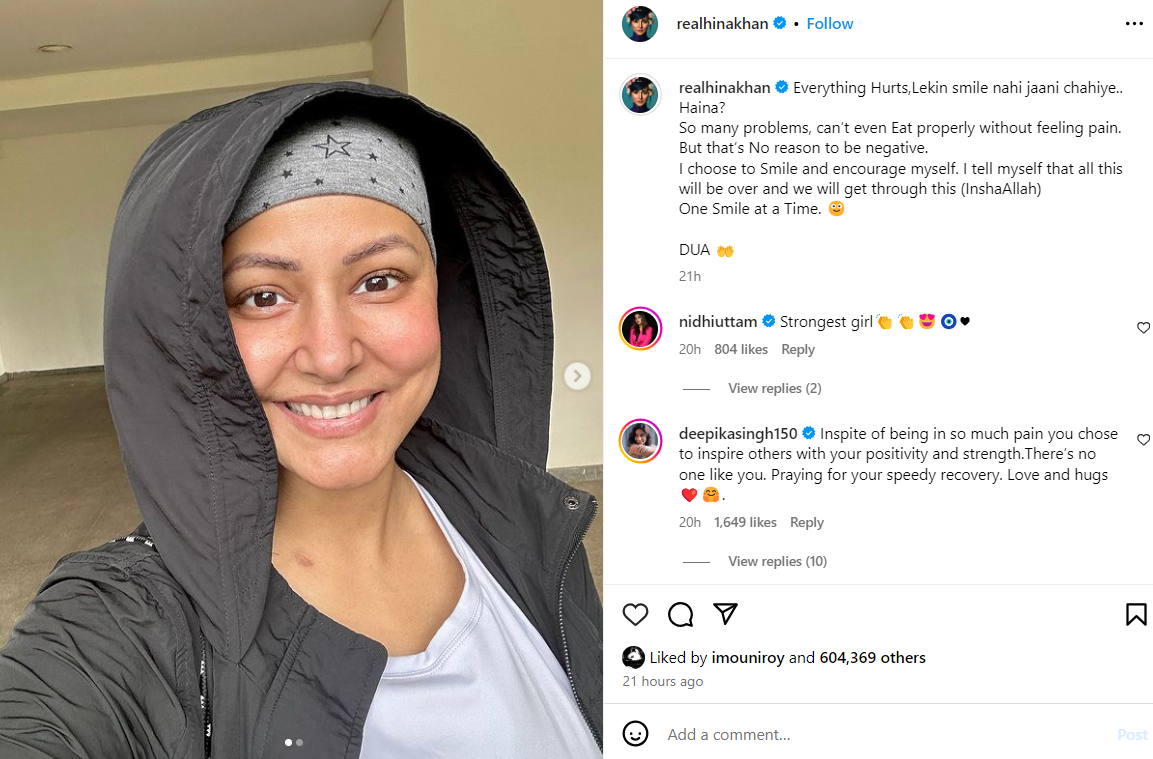 जिसे शेयर करते हुए उन्होंने कैप्शन में लिखा, "हर चीज दुःख रही है, लेकिन चेहरे से स्माइल नहीं जानी चाहिए, है ना? ढेर सारी दिक्कतें हैं, यहां तक कि बिना दर्द के खाना भी नहीं खा पा रही हूं, लेकिन नकारात्मक होने का कोई कारण नहीं है। मैंने स्माइल को चुना है और मैं खुद की हिम्मत बढ़ा रही हूं, मैं रोज खुद को कहती हूं कि ये फेज चला जाएगा और सब ठीक हो जाएगा। मुश्किल समय में एक स्माइल जरूरी है। दुआ"।