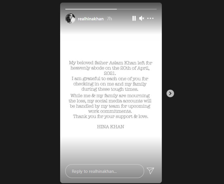 हिना खान ने अपने आधिकारिक इंस्टाग्राम अकाउंट से स्टोरी शेयर की है। जिसमें उन्होंने लिखा, 'मेरे प्यारे पापा असलम खान 20 अप्रैल 2021 को हम सबको छोड़कर चले गए। इस मुश्किल वक्त में आप सभी ने मेरे और मेरे परिवार के बारे में चिंता की इसके लिए मैं आप सभी की आभारी हूं। मैं और मेरा परिवार अभी शोक में हैं, ऐसे में मेरे वर्क कमिटमेंट के लिए सोशल मीडिया अकाउंट्स मेरी टीम हैंडल करेगी। आपके सपोर्ट और प्यार के लिए शुक्रिया- हिना खान'।