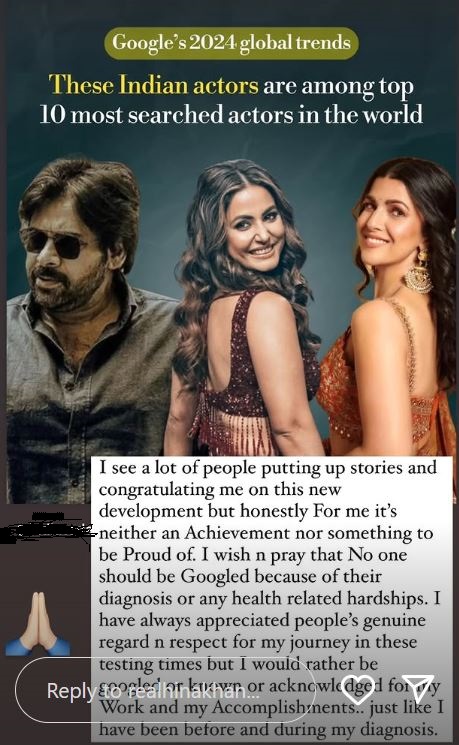 हिना खान ने गूगल मोस्ट सर्च्ड एक्टर्स की लिस्ट वाले एक पोस्ट को इंस्टाग्राम स्टोरी पर रीशेयर किया है और कैप्शन में लिखा है, "मैं देख रही हूं कि बहुत से लोग इस नई उपलब्धि पर पोस्ट कर रहे हैं और मुझे बधाई दे रहे हैं, लेकिन ईमानदारी से कहूं तो मेरे लिए यह न तो कोई उपलब्धि है और न ही गर्व करने लायक बात है। भगवान न करे किसी को उनकी बीमारी या स्वास्थ्य संबंधी कठिनाई के कारण गूगल पर सर्च किया जाए।"