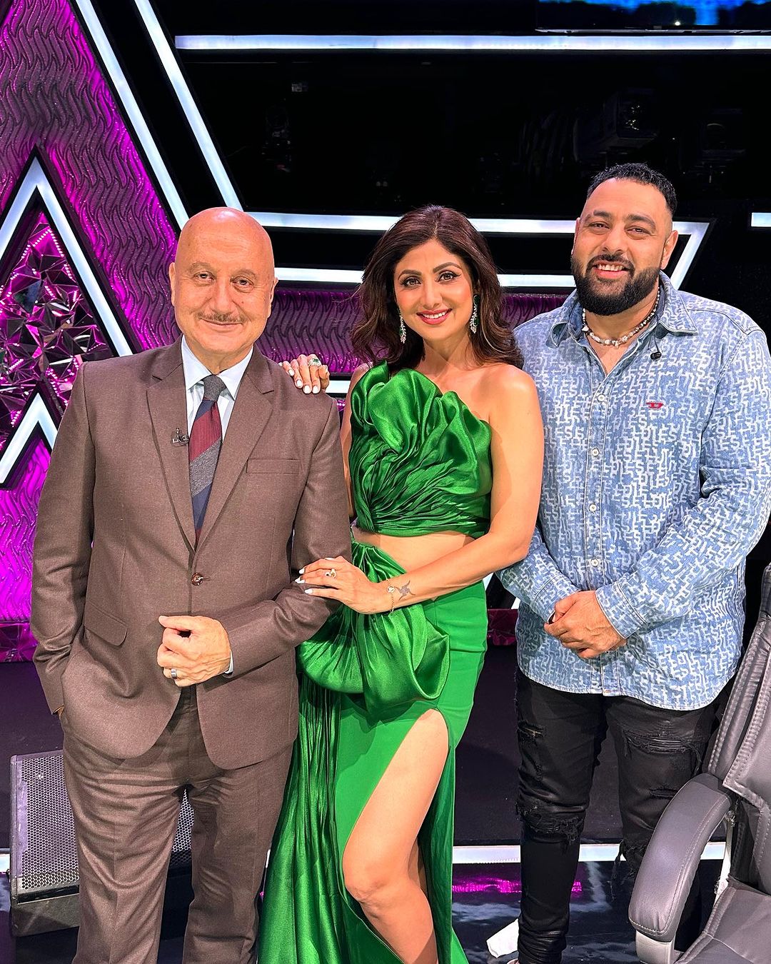 फोटो में अनुपम खेर व्हाइट रंग की शर्ट, स्ट्रिप टाई और ब्राउन जैकेट में नजर आ रहे हैं। शिल्पा ग्रीन थाई हाई स्लिट ड्रेस में बेहद ही खूबसूरत लग रही हैं। इसके अलावा बादशाह ब्लू-व्हाइट शर्ट, ब्लैक पैंट्स और स्नीकर्स में नजर आ रहे हैं।