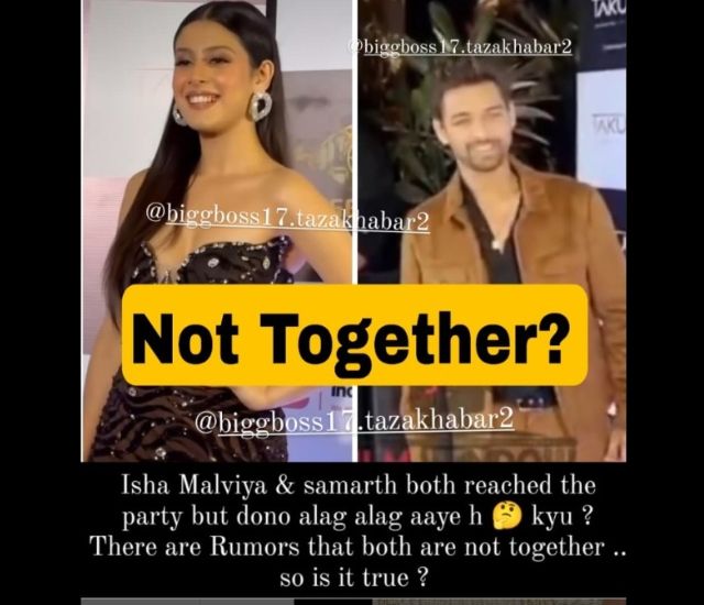 लेकिन बिग बॉस के घर से बाहर आते ही इन दोनों की राहें जुदा होने की खबरें समाने आना शुरू हो गई हैं।दरअसल बिग बॉस 17 ताजा खबर इंस्टाग्राम पेज ने एक पोस्ट शेयर किया है। इस पोस्ट में ये दावा किया गया है कि बीती रात मुंबई में हुई बिग बॉस कंटेस्टेंट्स की पार्टी में समर्थ जुरेल और ईशा मालवीय ने एक साथ एंट्री नहीं ली।