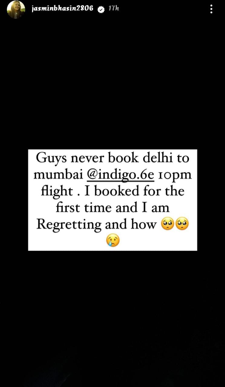 जैस्मिन भसीन ने अपनी इंस्टाग्राम स्टोरी पर पोस्ट शेयर कर एयरपोर्ट के बस में लॉक होने का एक्सपीरियंस शेयर किया है। परेशान होकर एक्ट्रेस ने एक पोस्ट में लिखा, "दोस्तों, कभी भी दिल्ली से मुंबई इंडिगो से रात 10 बजे की फ्लाइट बुक न करें। मैंने पहली बार बुक किया था और मुझे पछतावा हो रहा है।"