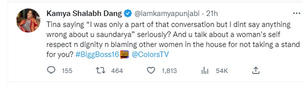 काम्या पंजाबी ने ट्वीट किया, 'टीना ने कहा मैं सिर्फ उस बातचीत का हिस्सा थी, लेकिन मैंने तुम्हारे बारे में कुछ गलत नहीं बोला सौंदर्या। सच में? तुम औरतों की इज्जत और आत्म सम्मान की बात करती हो लेकिन दूसरी औरतों पर तुम्हारे लिए खड़े न होने का आरोप लगाती हो।'