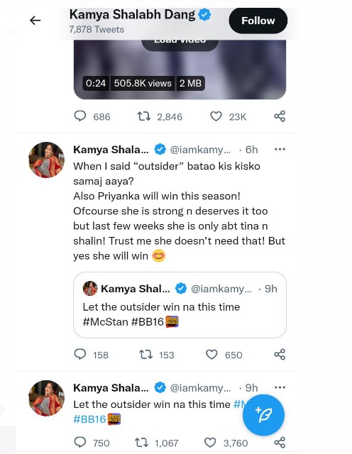 एक अन्य ट्वीट में काम्या पंजाबी ने कहा, 'जब मैंने आउटसाइडर की बात की बताओ किसको समझ में आया। यह भी कहना चाहती हूं कि प्रियंका इस सीजन को जीतेगी! हां वह स्ट्रांग है और यह जब भी करती है लेकिन पिछले कुछ समय से वह शालीन-टीना के टॉपिक पर आ गई है। मेरा यकीन करो उसे इसकी जरूरत नहीं है! लेकिन हां वह जीतेगी।'