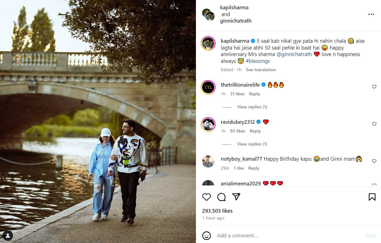 फैंस कपिल शर्मा और गिन्नी चतरथ की इस फोटो पर प्यार लुटाने से पीछे नहीं हटें। हालांकि, कुछ फैंस कपिल के कैप्शन को देख अपनी हंसी नहीं रोक पाए। एक यूजर ने लिखा, "शादी के पांच साल कैसे निकल गए, ये तो सिर्फ हमारी भाभी जी ही जानती हैं"।