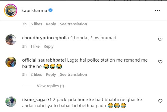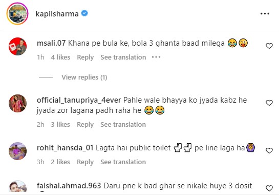 कपिल शर्मा द्वारा पोस्ट की गई इस तस्वीर को देखने के बाद सोशल मीडिया पर लोग कॉमेडियन की खूब खिंचाई कर रहे हैं। कोई उन्हें वाशरूम की याद दिला रहा है, तो कोई उनकी खिंचाई करते हुए कमेंट बॉक्स में ये लिख रहा है कि फ्लर्ट करने की वजह से भाभी ने घर से निकाल दिया। एक यूजर ने कमेंट करते हुए लिखा, 'इन तीनों की पत्नियों ने इतने जुल्म किए हैं, बेचारे मुंह भी ऊपर नहीं कर सकते हैं, दुनिया बड़ी जालिम है'। दूसरे यूजर ने लिखा, 'ये शो में कुछ ज्यादा ही फ्लर्ट करने के साइड इफेक्ट हैं। अन्य यूजर ने लिखा, 'पैक ज्यादा होने के बाद भाभी ने घर के अन्दर नहीं घुसने दिया तो बाहर ही बैठना पड़ा। एक अन्य यूजर ने लिखा, 'ऐसा लग रहा है खेत में तीनों दोस्त हल्के हो रहे हैं'। कपिल शर्मा की इस तस्वीर पर फैंस के कमेंट्स पढ़ने के बाद आप भी अपनी हंसी नहीं रोक पाएंगे।
