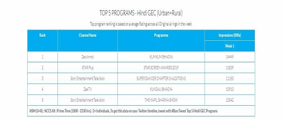 नागिन 3 लगातार पहले नंबर पर बना था लेकिन पिछले बार उसे नीचे आना पड़ा और इस बार वो छठे स्थान पर हैl स्टार स्क्रीन अवॉर्ड्स ने 9109 इंप्रेशन के साथ पहला स्थान हासिल किया है l सुपर डांसर्स चैप्टर 3' के ऑडीशन 7678 इंप्रेशन के साथ तीसरा स्थान रहे. कुंडली भाग्य, 6763 इंप्रेशन के साथ चौथे और बिग बॉस 12 का फिनाले 6245 इंप्रेशन के साथ पांचवे नंबर पर रहा l