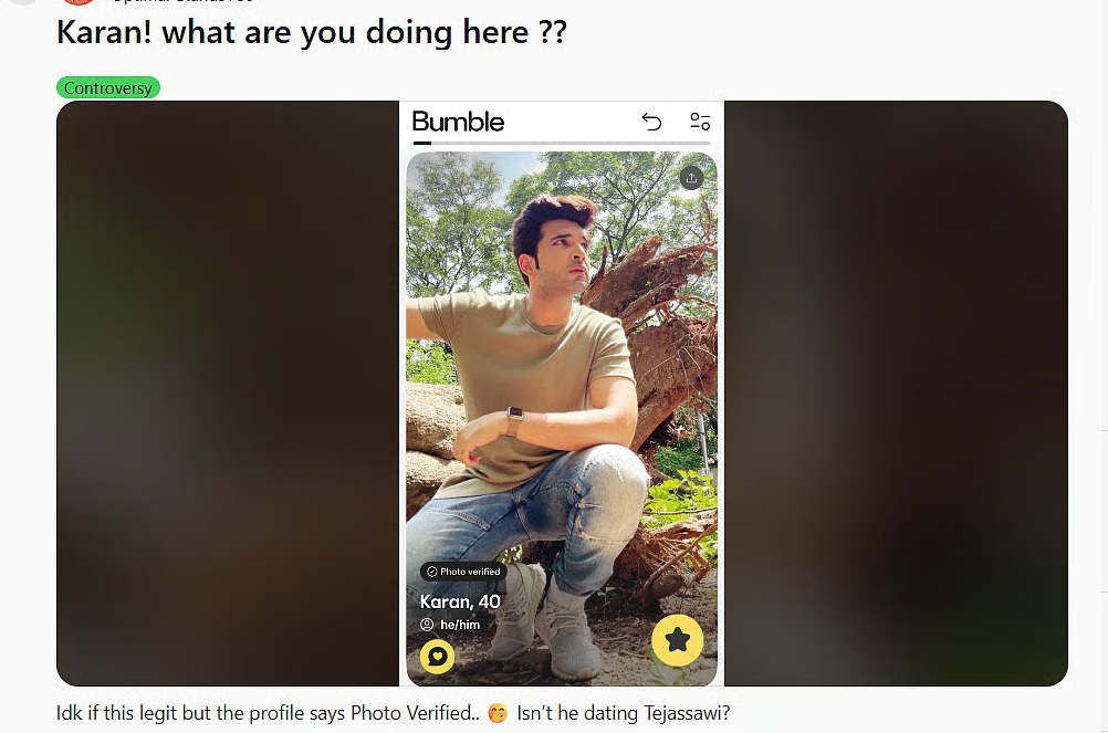रेडिट पर स्क्रीनशॉट सामने आने के बाद, कई यूजर्स ने सवाल उठाया कि तेजस्वी के साथ कमिटेड होने के बावजूद करण डेटिंग ऐप पर कैसे हो सकते हैं, जबकि कुछ ने इन दावों को सिरे से खारिज कर दिया और कहा कि तस्वीरों के साथ छेड़छाड़ की गई है।
