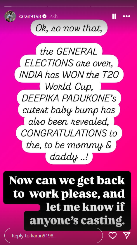 करण रविवार को इंस्टा स्टोरी पर पोस्ट शेयर कर लिखा- अब तो चुनाव भी खत्म हो गए। इंडिया ने टी20 वर्ल्ड कप भी जीत लिया। दीपिका पादुकोण ने अपना बेबी बंप भी दिखा दिया। बधाई हो होने वाले मम्मी-पापा को, अब क्या हम काम पर लौट सकते हैं? प्लीज कोई अगर कास्टिंग कर रहा हो तो मुझे बताएं।