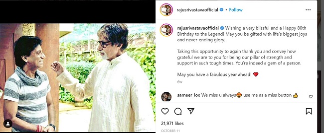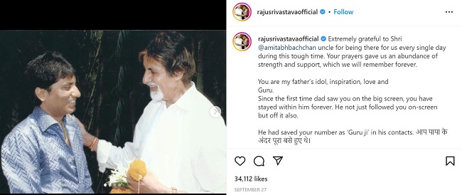 राजू श्रीवास्तव के परिवार ने अमिताभ बच्चन का आभार व्यक्त किया है
