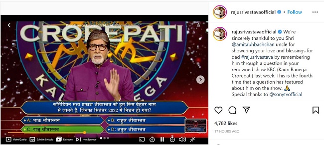 राजू श्रीवास्तव के परिवार के लोगों ने इंस्टाग्राम पर लिखा है, 'हम आदरणीय अमिताभ बच्चन जी के आभारी हैं। उन्होंने हमें बहुत प्यार और आशीर्वाद दिया है। उन्होंने क्विज के माध्यम से हमारे पिता को याद किया है। कौन बनेगा करोड़पति में यह चौथी बार है, जब इस प्रकार का प्रश्न शो में पूछा गया है। मैं सभी का आभार व्यक्त करता हूं।'