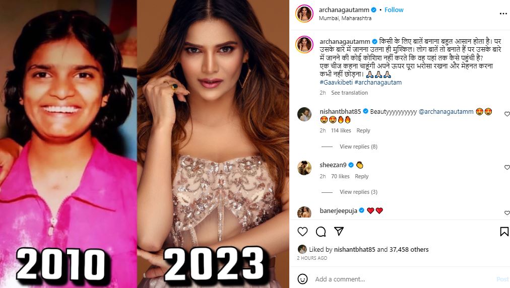 अपने जिंदगी के दो अलग-अलग पड़ाव को शेयर करते हुए अर्चना गौतम ने अपने दिल का हाल कैप्शन के जरिये बयां किया। उन्होंने कैप्शन में लिखा, "किसी के लिए बातें बनाना बहुत आसान होता है। पर उसके बारे में जानना उतना ही मुश्किल।