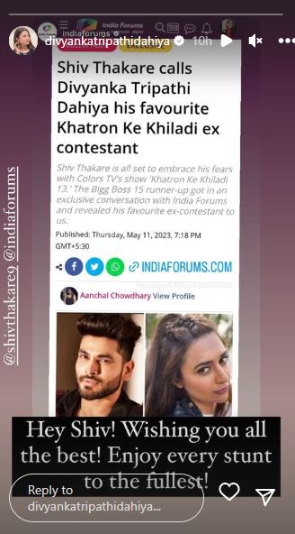 शिव ठाकरे को रोहित शेट्टी के शो में अपनी जर्नी शुरू करने से पहले उनकी पसंदीदा कंटेस्टेंट दिव्यांका त्रिपाठी ने भी अपनी बेस्ट विशेस दी। उन्होंने अपनी इंस्टा स्टोरी पर एक पोस्ट शेयर किया और लिखा, 'हे शिव, ऑल द बेस्ट, हर स्टंट को पूरी तरह से एन्जॉय करना'।