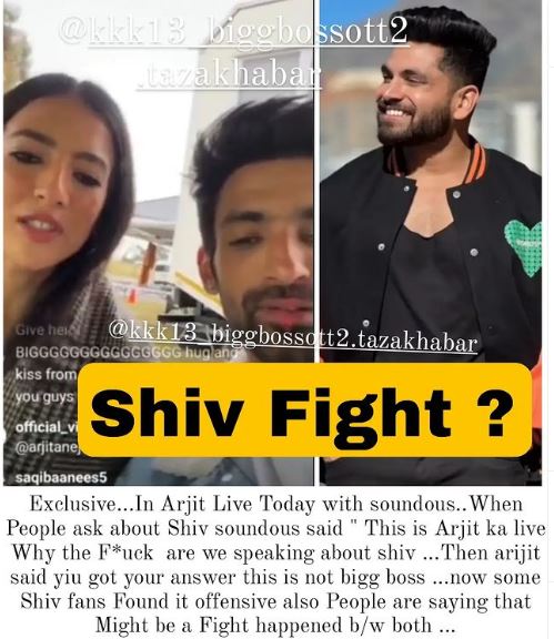 उनके इंस्टाग्राम लाइव पर फैंस ने शिव से जुड़े सवाल करना शुरू कर दिया। जिसके बाद सौंदस ने कहा, "ये अरिजीत का लाइव है, लोग यहां पर शिव की बात क्यों कर रहे हैं"। जिसके बाद अरिजीत ने भी जवाब देते हुए कहा, "आप सबको आपका जवाब मिल गया, ये बिग बॉस का घर नहीं है"।