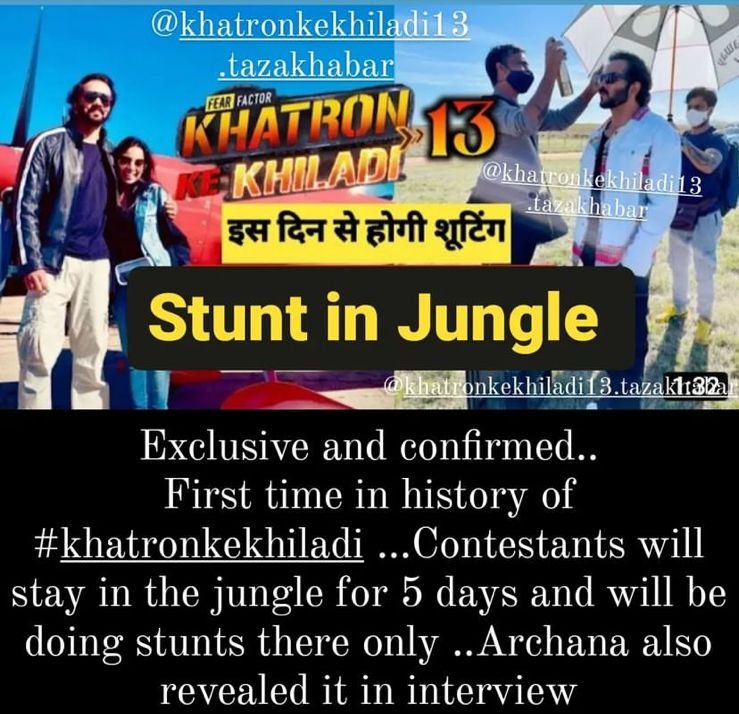 मीडिया रिपोर्ट्स की मानें तो पहली बार खतरों के खिलाड़ी सीजन 13 के इतिहास में कंटेस्टेंट 5 दिनों तक जंगल में रहेंगे और वहीं पर शो के होस्ट और निर्देशक रोहित शेट्टी उनसे खतरनाक स्टंट करवाने वाले हैं। बिग बॉस 16 कंटेस्टेंट अर्चना गौतम ने भी हाल ही में खुद भी अपने एक इंटरव्यू में कन्फर्म किया था कि इस सीजन में कई बड़े ट्विस्ट देखने को मिलेंगे।