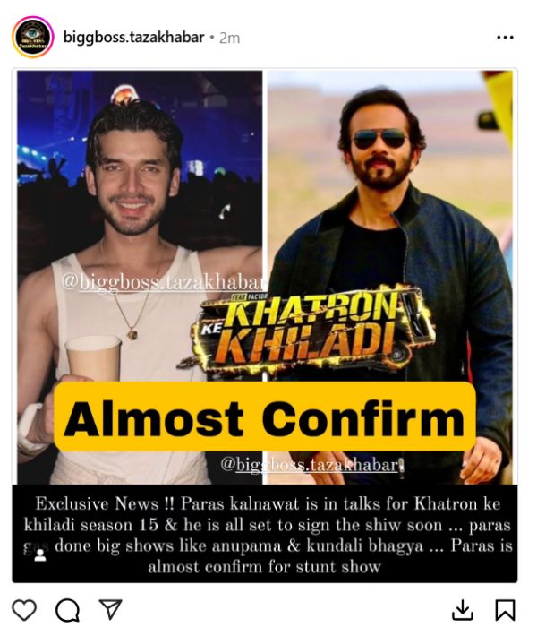 बिग बॉस ताजा खबर की रिपोर्ट के मुताबिक, पारस कलनावत की खतरों के खिलाड़ी के लिए बातचीत चल रही है और वह जल्द शो साइन करने वाले हैं। माना जा रहा है कि पारस का नाम स्टंट शो के लिए लगभग कंफर्म है।
