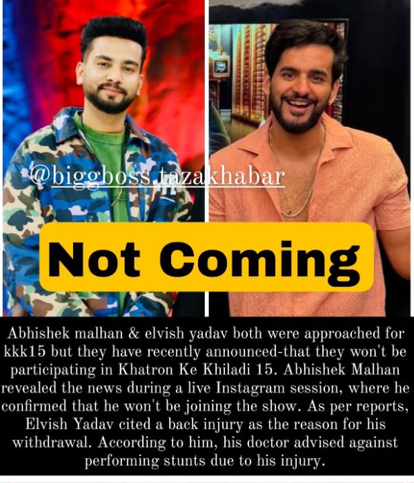 यूट्यूबर्स और सोशल मीडिया इन्फ्लुएंसर्स अभिषेक मल्हान ने भी खतरों के खिलाड़ी 15 का हिस्सा बनने से मना कर दिया है। अभिषेक ने खुद इंस्टाग्राम लाइव में इस बात की पुष्टि की है कि वह रोहित शेट्टी के शो का हिस्सा नहीं बनेंगे।